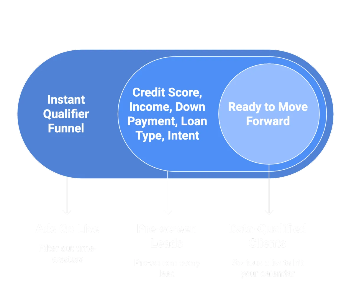 The moment your ads go live, you’ll be connected to our proprietary Instant Qualifier Funnel to automatically filter out time wasters and pre-screen every lead for credit score, income, down payment, loan type, and intent.